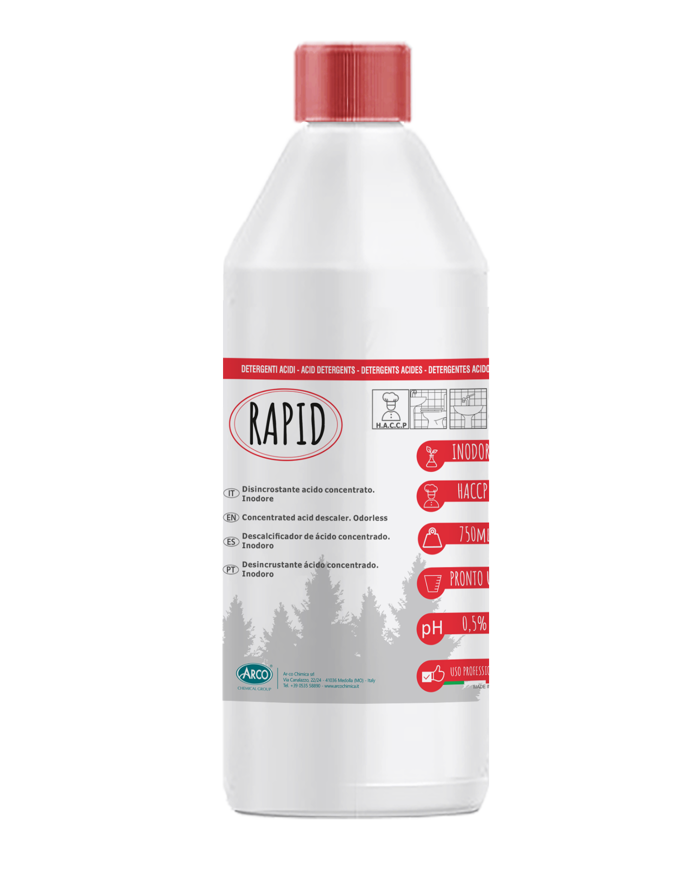 RAPID è un detergente acido inodore a base di acido fosforico, indicato per la rimozione di calcare e residui organici da sanitari, macchine da caffè e pentolame in inox o alluminio. Il prodotto agisce in profondità eliminando anche incrostazioni di origine amidacea. Formulato per utilizzo professionale, RAPID è idoneo per ambienti in cui si applica il protocollo HACCP. Si consiglia di seguire attentamente le modalità d’uso e le precauzioni riportate in etichetta.