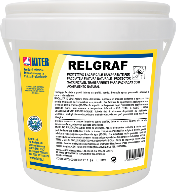 RELGRAF tanica 6 L è una vernice protettiva trasparente all’acqua a base polimerico-olefinica con finitura naturale. Ideale per la difesa di facciate e pareti interne ed esterne da graffiti, pennarelli, vernici spray, adesivi e smog. Traspirante, monocomponente, inodore, permette la rimozione dei graffiti senza danneggiare la superficie. Indicato per edifici pubblici, scuole, musei e supporti porosi o sintetici. Per uso professionale.