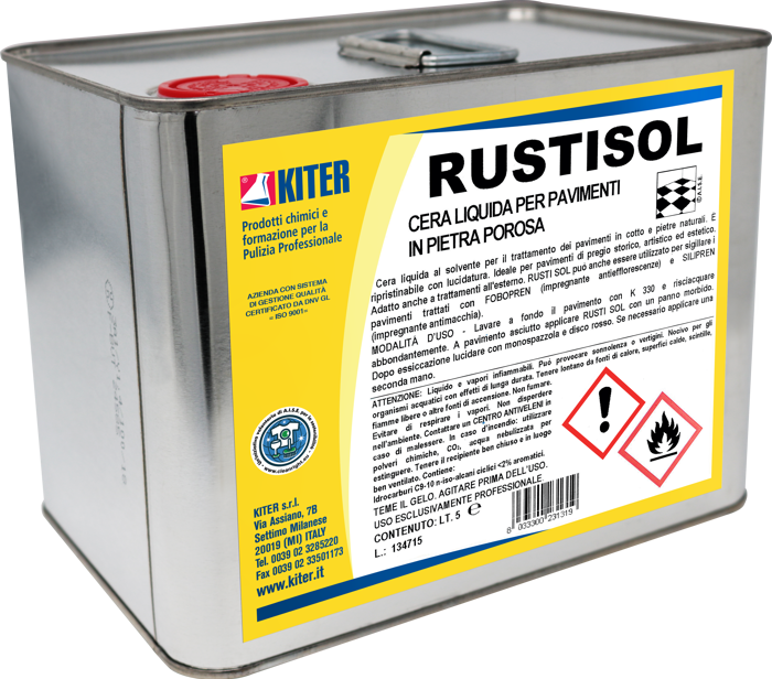 Cera liquida al solvente per cotto e pietre naturali, Rustisol protegge pavimenti di valore storico, artistico o estetico da sporco, macchie e umidità. Dona una finitura calda e satinata, ideale anche per esterni. Facile da applicare e rinnovare con lucidatura, è disponibile nella versione tingente ad effetto antichizzante. Uso professionale. Conservare lontano da fonti di calore, agitare prima dell’uso. Tanica da 5 litri.