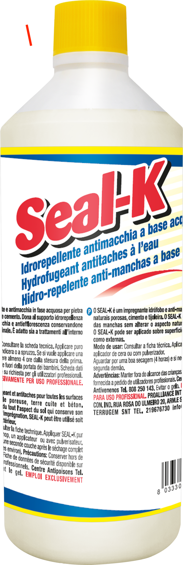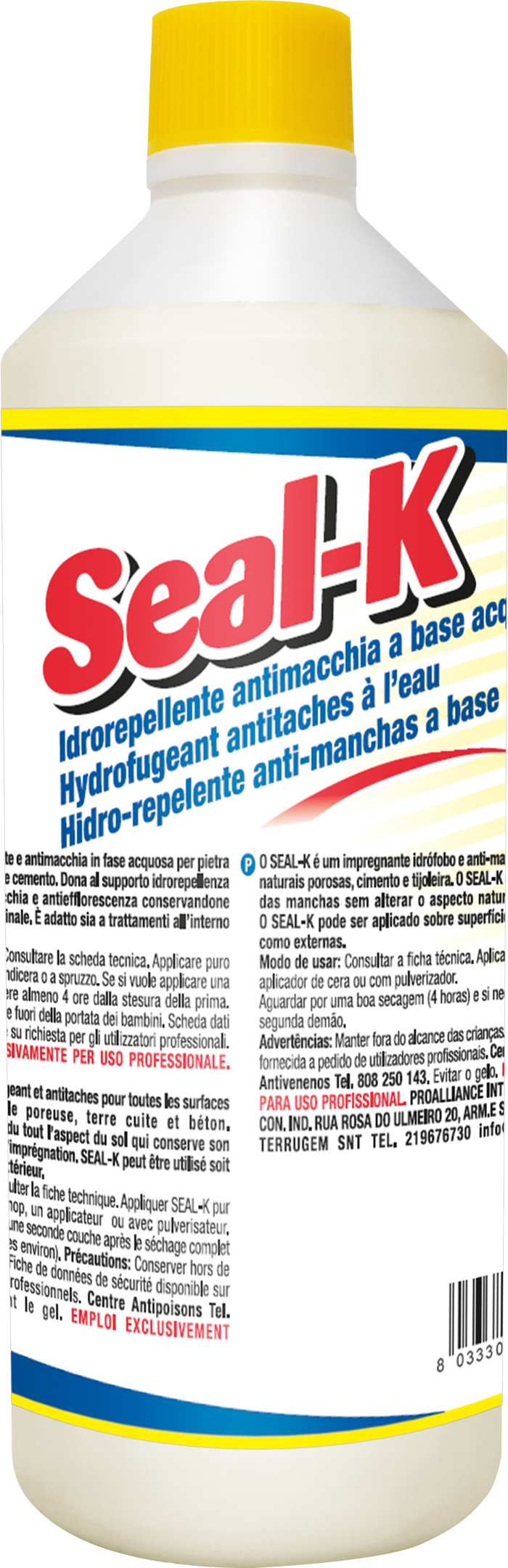 SEAL K è una soluzione idrorepellente e antimacchia in fase acquosa, ideale per la protezione di superfici in pietra naturale grezza, cotto e cemento, sia in ambienti interni che esterni. L’applicazione preserva l’aspetto originario dei materiali e previene la formazione di efflorescenze, senza alterare colore e traspirabilità. Consente facili operazioni di pulizia, grazie all’azione antistatica che impedisce la penetrazione di olio, grassi e liquidi. Adatto a contesti professionali come cucine, ristoranti, garages e abitazioni private. SEAL K garantisce rapidità di asciugatura e praticità d’uso.