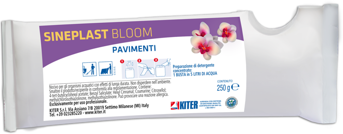 SINEPLAST BLOOM è una minibag da 250 g per la preparazione di 5 litri di detergente concentrato pavimenti con profumo di rosa. Studiato per uso professionale, è indicato per la pulizia giornaliera di superfici dure e resilienti, senza bisogno di risciacquo. Dona brillantezza e un gradevole profumo, non lascia residui né aloni. La soluzione è pronta in pochi passaggi, rispetta l’ambiente grazie a tensioattivi biodegradabili. Non miscelare con altri prodotti.