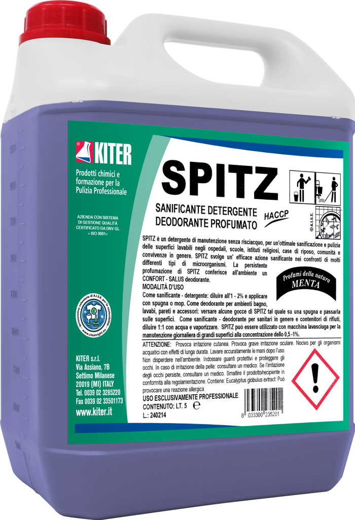 SPITZ è un detergente sanificante professionale a base di sali d’ammonio quaternario, caratterizzato da una profumazione intensa alla menta. Ideale per la pulizia di pavimenti, superfici lavabili e ambienti collettivi come scuole, ospedali, hotel e uffici. Garantisce igiene, rinfresca e deodora gli spazi senza lasciare residui. Adatto per programmi HACCP. Usare guanti protettivi durante l’applicazione. Prodotto destinato esclusivamente a uso professionale.