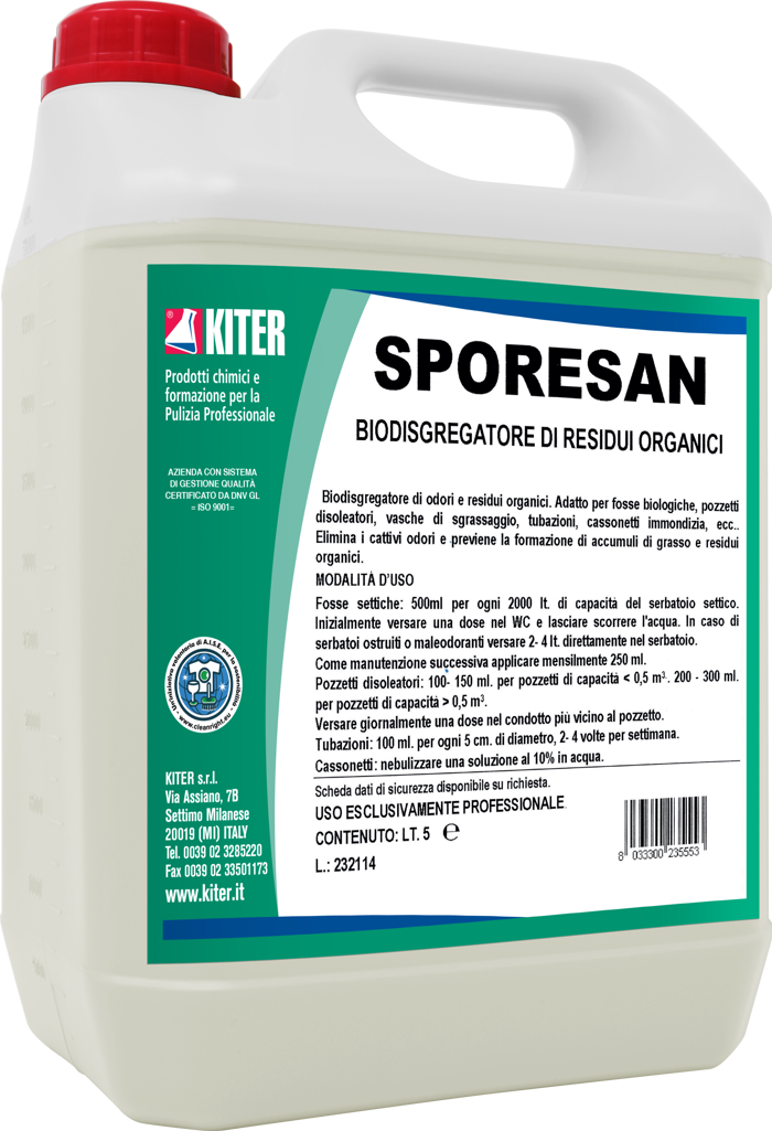 SPORESAN tanica da 5 litri è un detergente sanificante a base di sali d’ammonio quaternario, ideale per la sanificazione professionale. La profumazione intensa di menta garantisce un ambiente piacevolmente fresco e deodorizzato, donando benessere. Indicato per il trattamento di superfici, fosse biologiche, tubazioni e cassonetti, il prodotto elimina efficacemente residui organici e cattivi odori. Biodegradabile, sicuro e semplice da utilizzare.