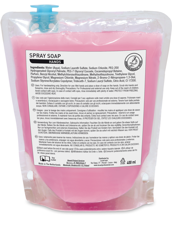 Spray Soap ML.400 Hands è il sapone lavamani firmato Hygenius in formato spray da 400 ml, progettato per rispondere alle esigenze di chi desidera praticità e igiene quotidiana. Grazie alla sua formula, assicura una detersione efficace delle mani, perfetta sia per ambienti professionali sia domestici. Facile da applicare, lascia la pelle fresca e piacevolmente pulita senza ungere. Ideale sia in ufficio che in laboratorio, è una soluzione appartenente ai migliori standard per la cura delle mani.