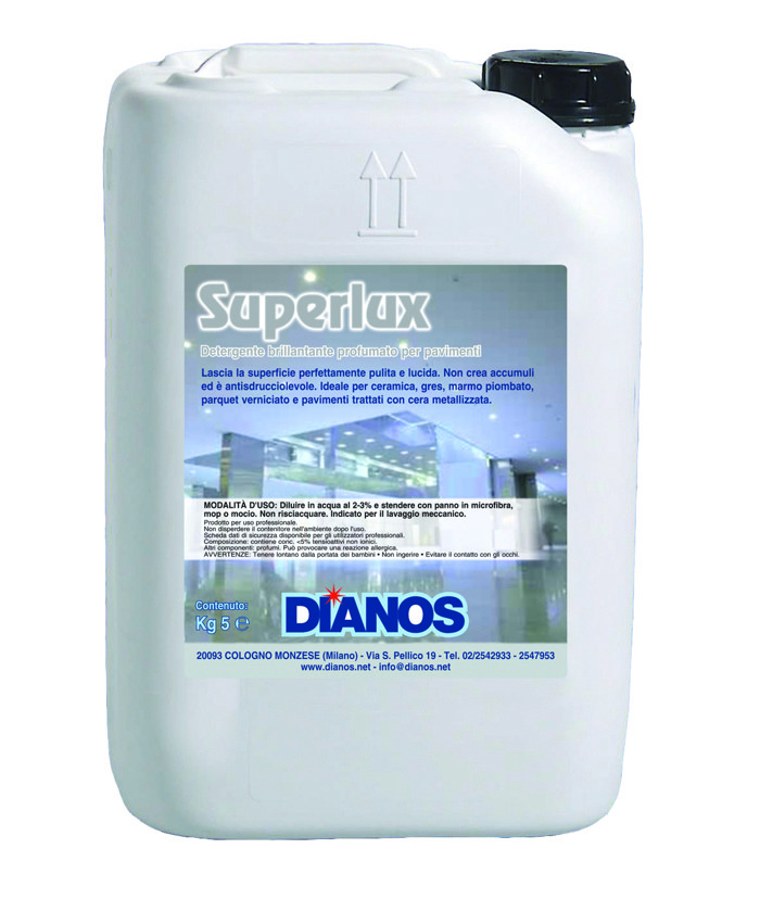 Superlux è un detergente profumato ad azione lucidante studiato per offrire una pulizia profonda e un risultato brillante su ceramica, marmo piombato, gres, parquet verniciato, linoleum, PVC, resine e superfici trattate con cera o resine. Grazie alla sua formula lascia i pavimenti puliti, lucidi e piacevolmente profumati nell'ambiente.