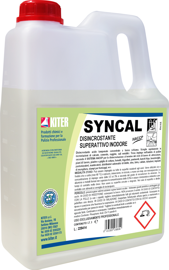 SYNCAL è un disincrostante acido concentrato inodore specifico per la rimozione rapida di calcare, sali e residui organici da impianti, tubazioni, lavastoviglie, caldaie, serbatoi e pavimenti. Indicato per cicli di pulizia HACCP in industrie alimentari, lattiero-casearie e ristorazione collettiva. Prodotto liquido a bassa schiuma, compatibile con acciaio inox e materiali resistenti agli acidi. Utilizzo esclusivamente professionale.