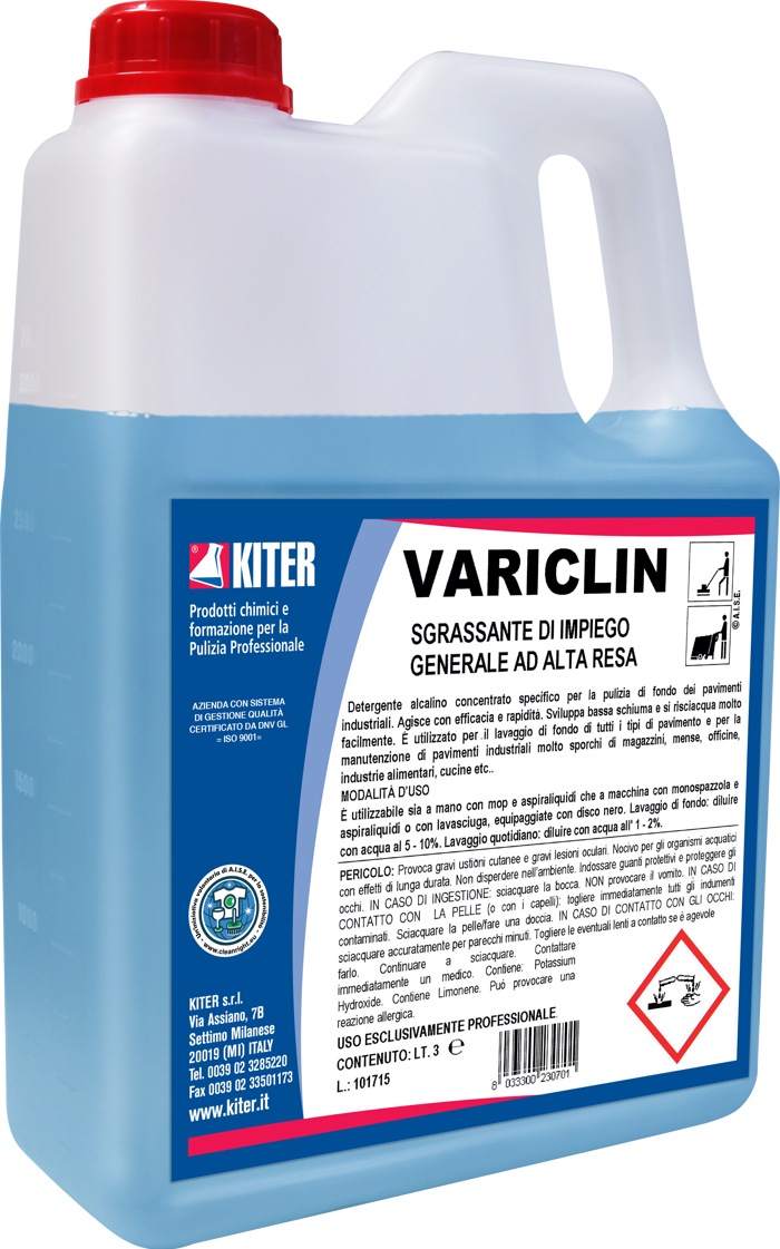 VARICLIN tanica 3 L è un detergente sgrassante alcalino, ideale per lavasciuga e pulizie di fondo su pavimenti industriali. Indicato per mense, magazzini, supermercati e officine, rimuove velocemente sporchi grassi da superfici dure non verniciate. La formula a bassa schiuma garantisce un risciacquo agevole. Prodotto professionale, si consiglia l’utilizzo di dispositivi di protezione durante l’uso. Non utilizzare su legno.