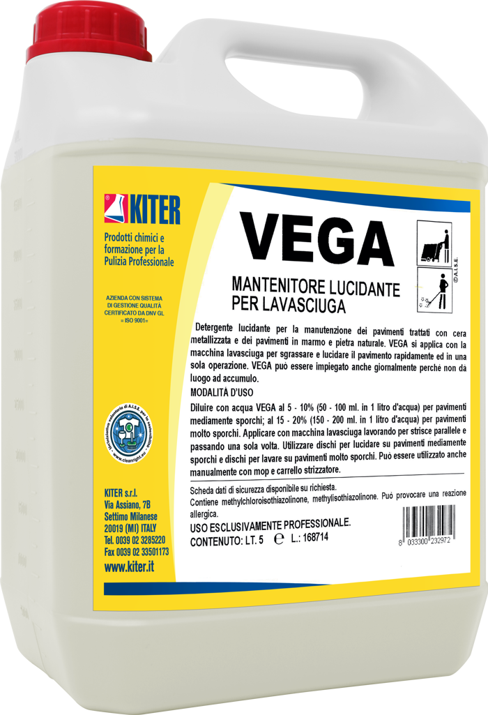 VEGA è un detergente lucidante concentrato senza accumulo, indicato per la manutenzione di grandi superfici con macchina lavasciuga. Rimuove lo sporco e lascia una pellicola protettiva, mantenendo i pavimenti brillanti senza necessità di deceratura. Idoneo per superfici come pietra naturale, pvc, linoleum e cemento, garantisce azione efficace e rapida senza produrre schiuma. Da utilizzare solo in ambito professionale. Profumazione delicata di pino.